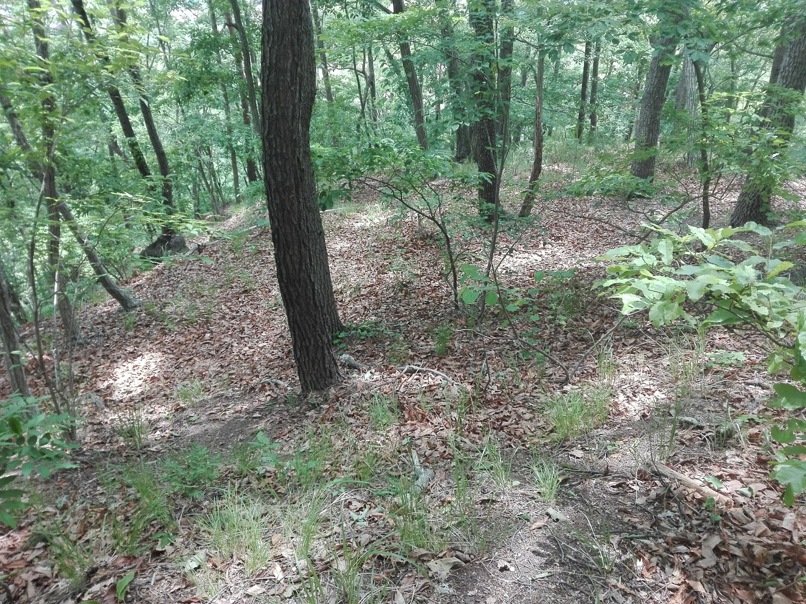 尾根先付近西側斜面の段郭状削平地。畑地化された跡かもしれないが、大手と推測される付近でもあり何かあってもおかしくない。