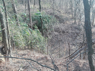 土塁裏(南側)の堀切。大堀切と言ってもよい。大土塁と大堀切のコンビネーションはやはり素晴らしい。西斜面の下には麓の道路が見えるが、かつては天神城西側にはすぐ裾を八丁地川が流れて堀の役目をしていたと想像する。