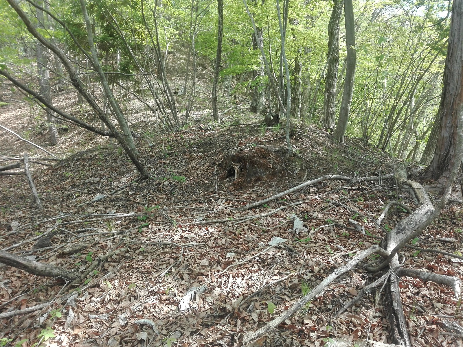 位置を見失ったので確信はないが、おそらく縄張り図に無い下の方にも二条の堀切のようなものがあった。さらに下には林業の作業道路なのか、犬走り敵な郭なのか掘割なのか不明なものがある。